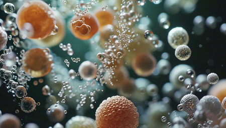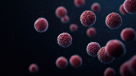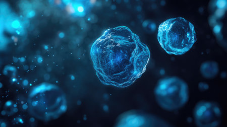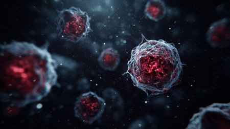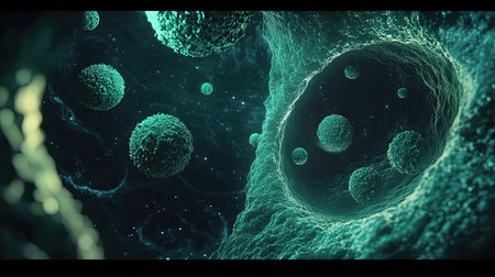 An intriguing close-up view of microscopic cells floating in a dark background, illustrating the complexity of biological structures and cellular environments.