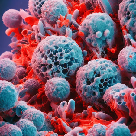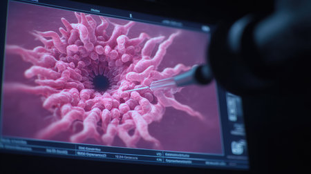 This close-up image depicts cancer cells under laboratory equipment, showcasing intricate details for medical analysis and health research. Ideal for educational use.