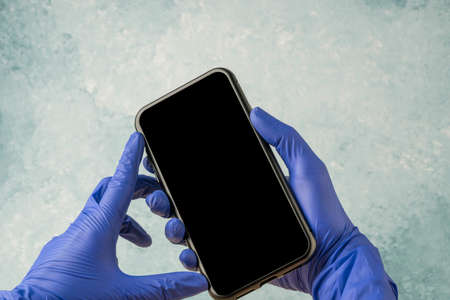hands wearing blue surgery gloves while holding a mobile phone with a blank screen