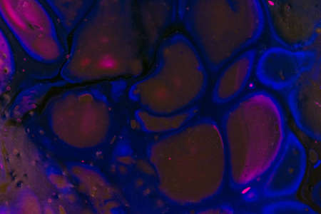 Ink color blend. Paint water drop. Transition reveal effect. Neon pink blue fluid splash on vibrant purple fume texture creative abstract background shot on Red Cinema camera 6k.