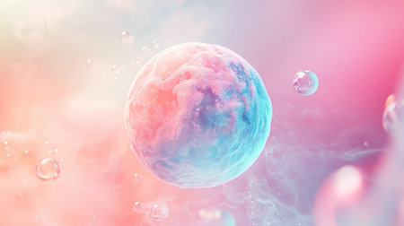 A striking surreal scene with a pink and blue abstract pastel sphere, gently floating among delicate foam bubbles, set against a soft gradient background.