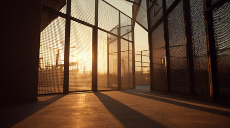 A view of a gate and doors leading to a sunrise through the entrance. The morning light shines through the bars, creating a warm and golden glow.
