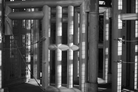 sun and shadows form on the bars of a prison
