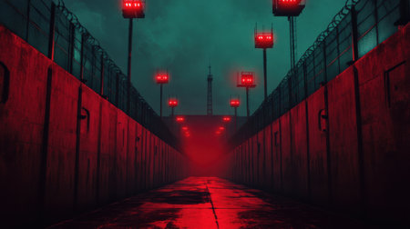 Within a bleak prison city, towering electrified walls and menacing red surveillance towers dominate the landscape. Endless concrete cells stretch into the eerie distance, creating a sense of despair.