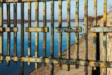 Rusty old railing on the embankment near the river