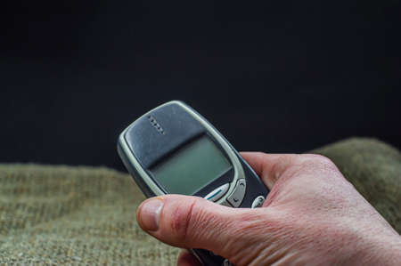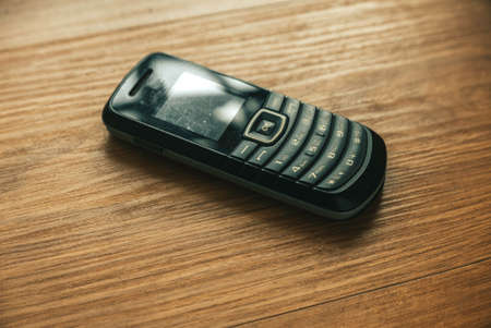 Mobile phone old fashioned style on wooden background.