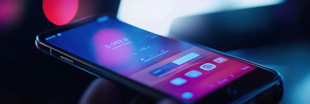 Hand holding illuminated smart phone, close up of touch screen technology generated by artificial intelligence