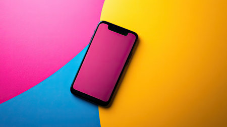 A sleek smartphone rests on a vibrant, colorful background featuring playful curved shapes. The image showcases a minimalistic design with bright pink, yellow, and blue tones, creating a modern and artistic look. This composition is perfect for technology, lifestyle, and artistic themes.