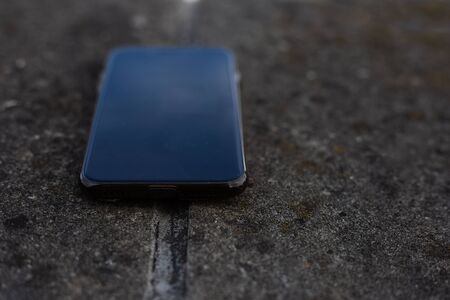 Close-up of black smartphone on stone table.