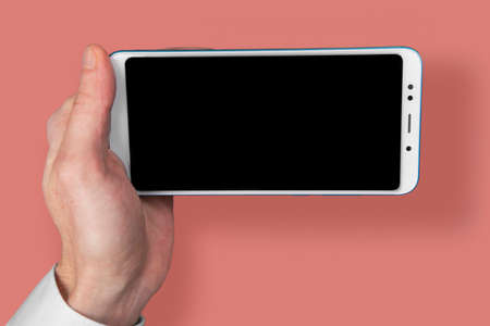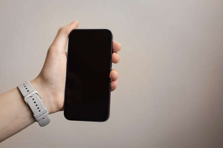 Male hand holding a mobile phone with black screen mockup. Template for web design or app presentation. Gadget closeup. Space for text. Concept of digitalization, business, remote work and freelance