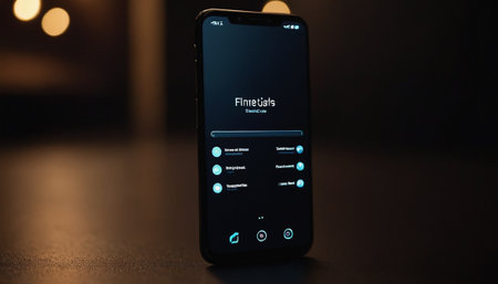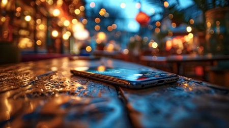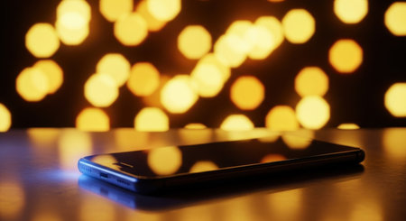 A close-up shot of a smartphone lying on a table with blurred bokeh lights creating a warm atmosphere.