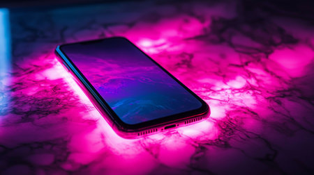 A sleek modern smartphone placed on a marble surface with vibrant neon pink and purple lights reflecting on it, creating a futuristic and stylish technology theme.