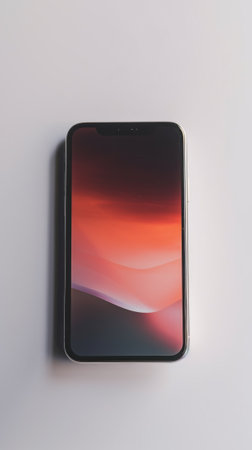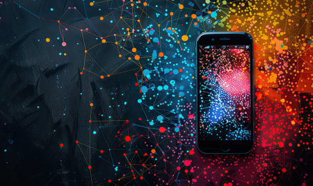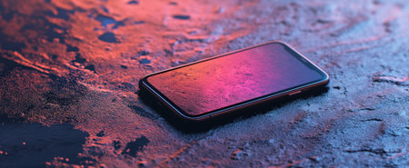 A sleek smartphone rests on a textured surface, exhibiting colorful reflections and a vibrant atmosphere. Ideal for technology and lifestyle themes.