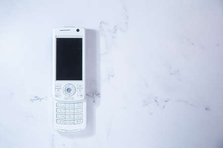 Smartphone with blank white screen on white background. Top view.