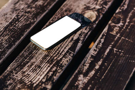 Mockup phone with a white screen lies on the background of a dilapidated wooden bench.