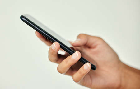 Young man using smartphone. Hand holding mobile texting message contact us.chatting,search internet information. Technology device communication connecting.