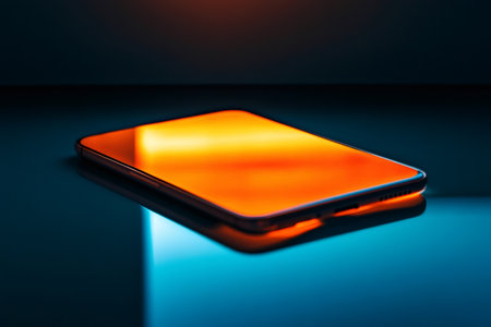 Modern smartphone featuring a blank orange screen, reflecting beautifully on a dark glass surface, creating a striking visual in low light
