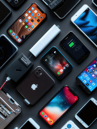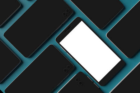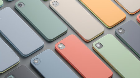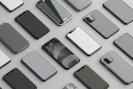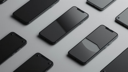A collection of modern smartphones arranged in various angles on a gray background, perfect for showing mobile technology and accessories.