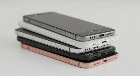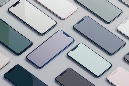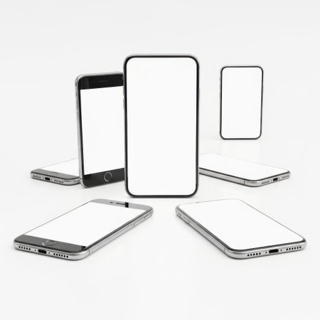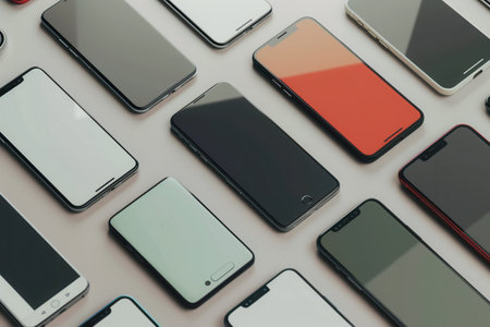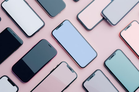 Several smartphones are arranged on a light background. They are perfect for mobile technology and smartphone accessory companies.