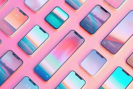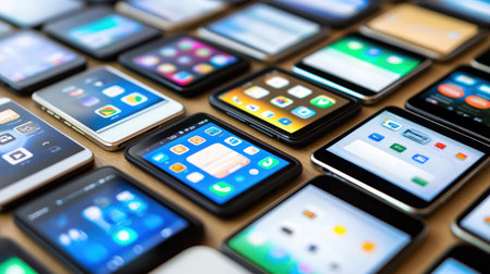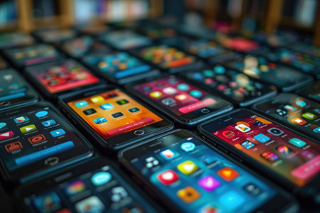 A visually captivating arrangement of modern smartphones showcasing vibrant app icons and digital interfaces, emphasizing the blend of technology and communication in daily life.
