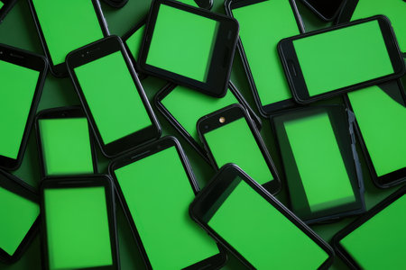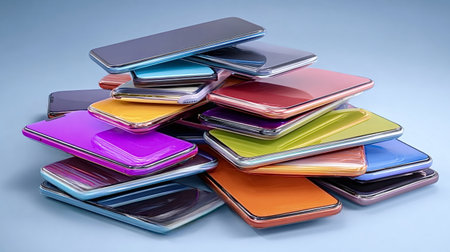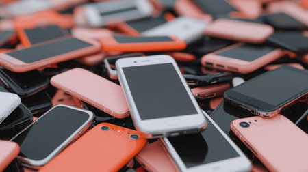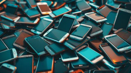 Pile of vibrant new smartphones stacking up, representing themes of technology addiction, consumerism, planned obsolescence, and the growing problem of electronic waste