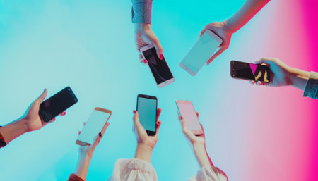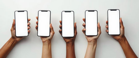 Five hands of varying skin tones are prominently displayed, each holding a smartphone with a blank screen, creating a striking visual of unity in diversity. This image captures the essence of modern communication, highlighting the shared experience of technology while celebrating the beauty of different backgrounds.