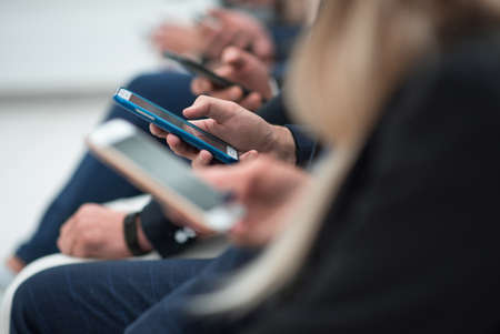 Get connected and stay in the know. Closeup shot of a group of unrecognizable businesspeople using their cellphones in synchronicity.