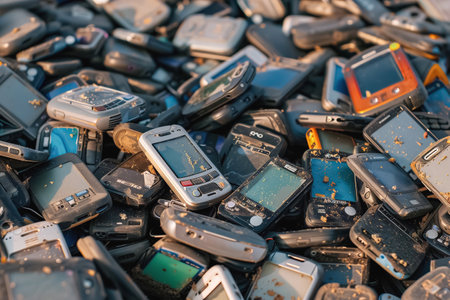 A close-up shot captures a vast collection of old mobile phones, highlighting the ongoing issue of electronic waste and its environmental implications.