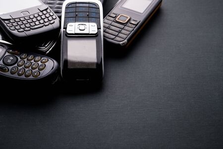 Pile of used old models of mobile phones, black and white, lying down on blue background. copyspace.