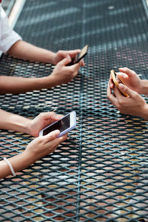 Cropped image of three smartphones in hands of ttriple twin on the metal table.