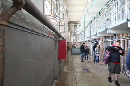 Alcatraz Prison B Block Prisoners cell area and some tourist and visitors inside the cellhouse building, San Francisco California USA, March 30, 2020