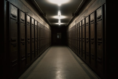 Haunting green-tinted hallway with lockers