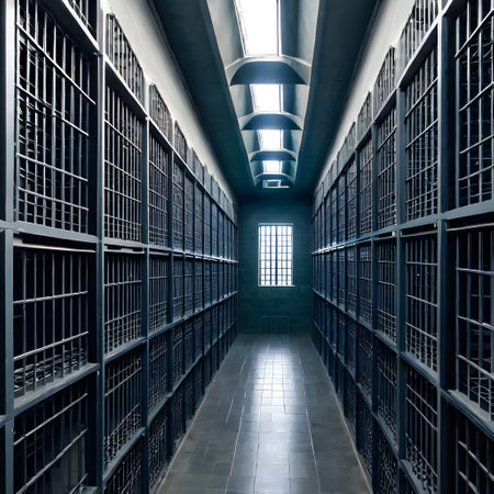 A monochrome image capturing the long, desolate corridor of a prison, lined with barred cells on both sides, invoking a sense of confinement.
