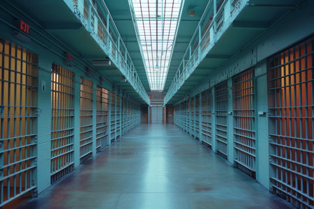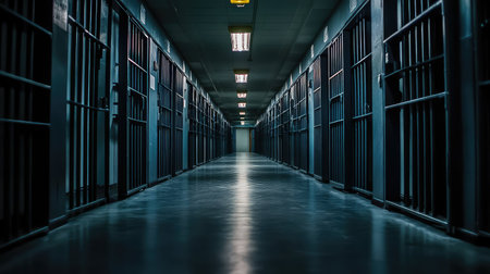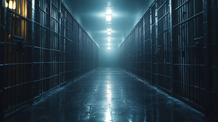 A concept image of an eerie corridor in a prison at night showing jail cells dimly illuminated by various ominous lights