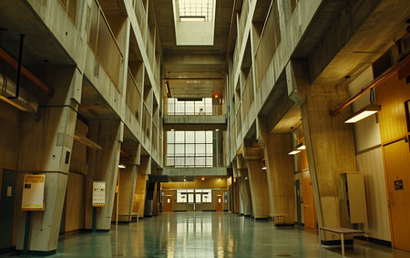 An expansive and vacant prison corridor featuring steel bars and clean, neutral walls. This setting emphasizes the stark atmosphere of correctional institutions.