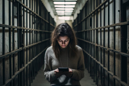 An image portraying a girl holding a smartphone inside an open prison with the door wide open, representing the mental captivity caused by social media