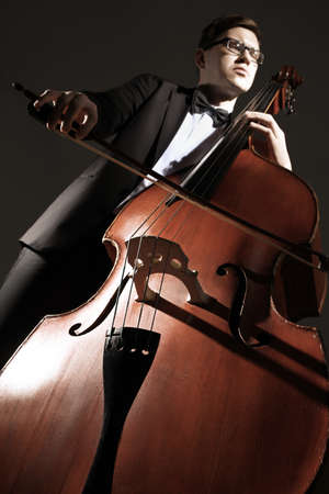 Double bass player contrabass playing. Classical musician jazz bassist. Cello
