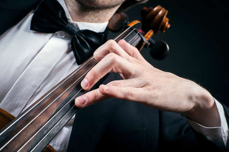 Cello player cellist playing music instrument hands closeup. Orchestra instruments