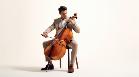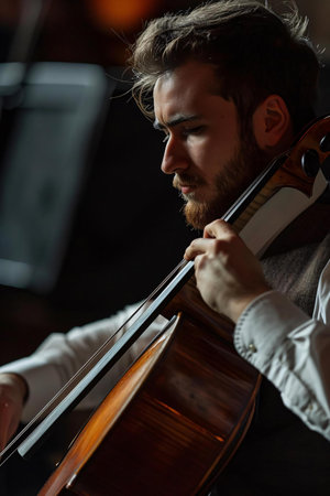 A talented musician sits in a dramatic pose, playing the cello with a deep focus, surrounded by soft shadows and artistic lighting, evoking powerful emotions.