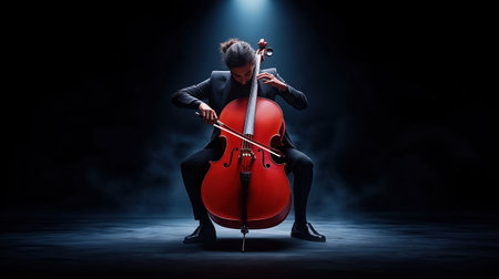 A skilled musician plays a vibrant red cello, immersed in deep concentration. The setting features a dark background illuminated by a single spotlight, creating an intense atmosphere.