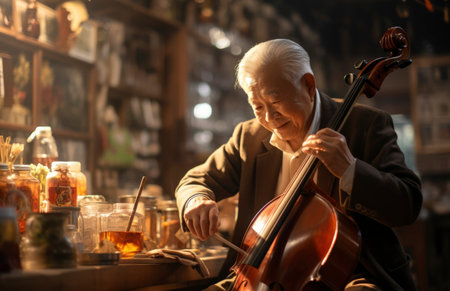 Lonely musical composer with cello and sparkling musical notes around