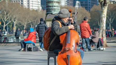 Cello player cellist in a free outdoor concert at a public park, musician plays the cello