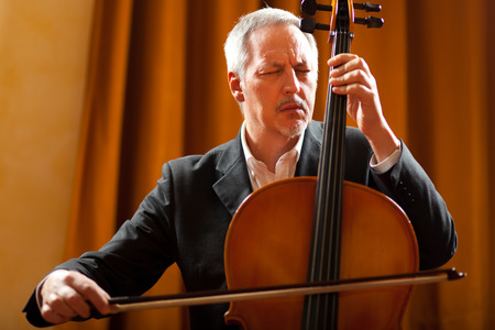 Cellist playing violoncello musical instrument of orchestra