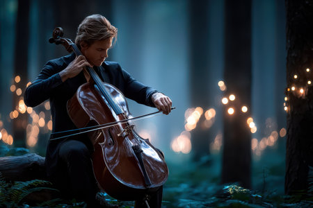 A skilled cellist performs amid tall trees, surrounded by magical fairy lights that create a serene atmosphere.