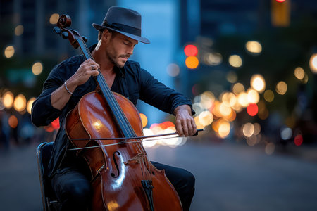 A skilled cellist performs on a busy urban street as twilight sets in, captivating passersby with music.