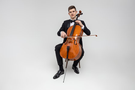 Cello player playing violoncello. Cellist with musical instruments