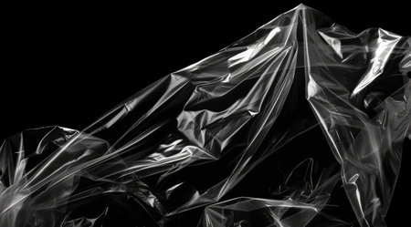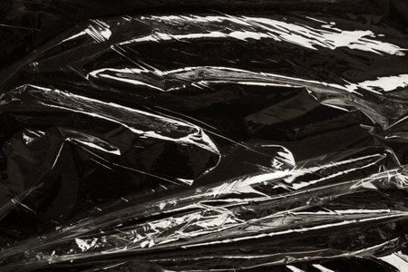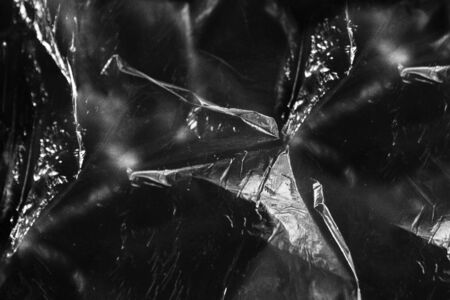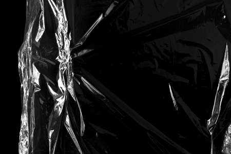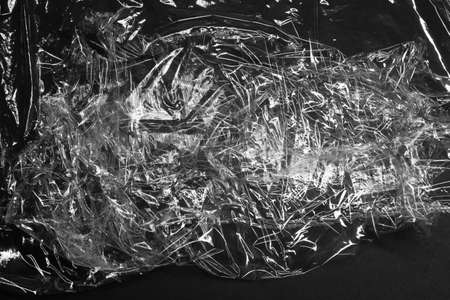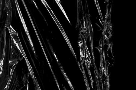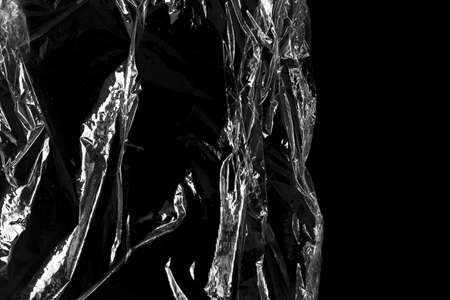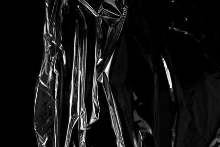 Reflecting light and shadow on creases and folds in scrunched clear plastic foil on black background. monochrome light and texture, abstract background image.