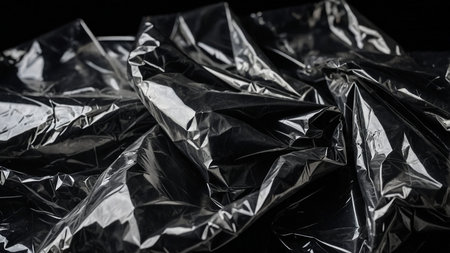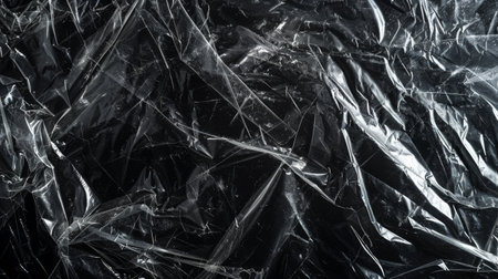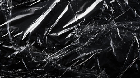 This image displays crumpled and wrinkled shiny black plastic sheets that reflect light, creating an abstract and intriguing artistic effect representing modern texture and industrial style. AI generated image