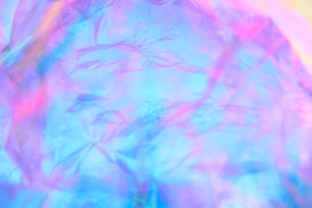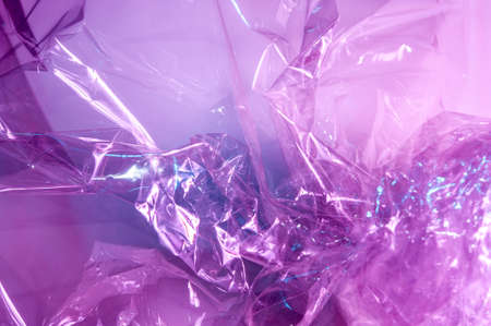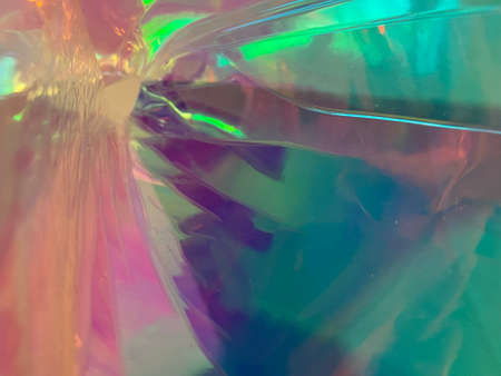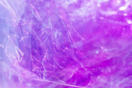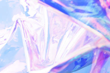 Transparent holographic wrinkled polyethylene background. Holographic colorful plastic film in blue, purple and pink tones with copy space. High quality photo