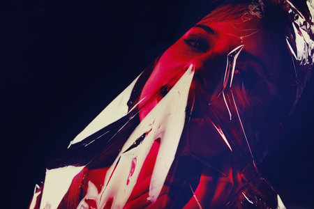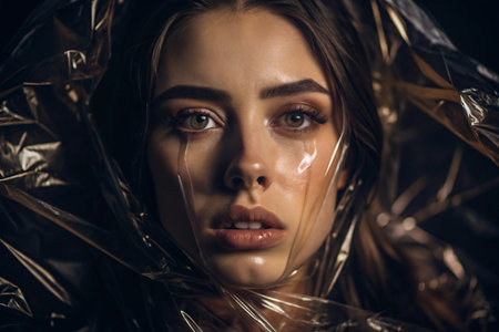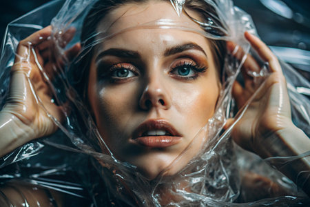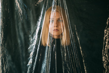Thoughtful woman creatively hidden behind translucent plastic exploring isolation in captivating surreal conceptual image.
